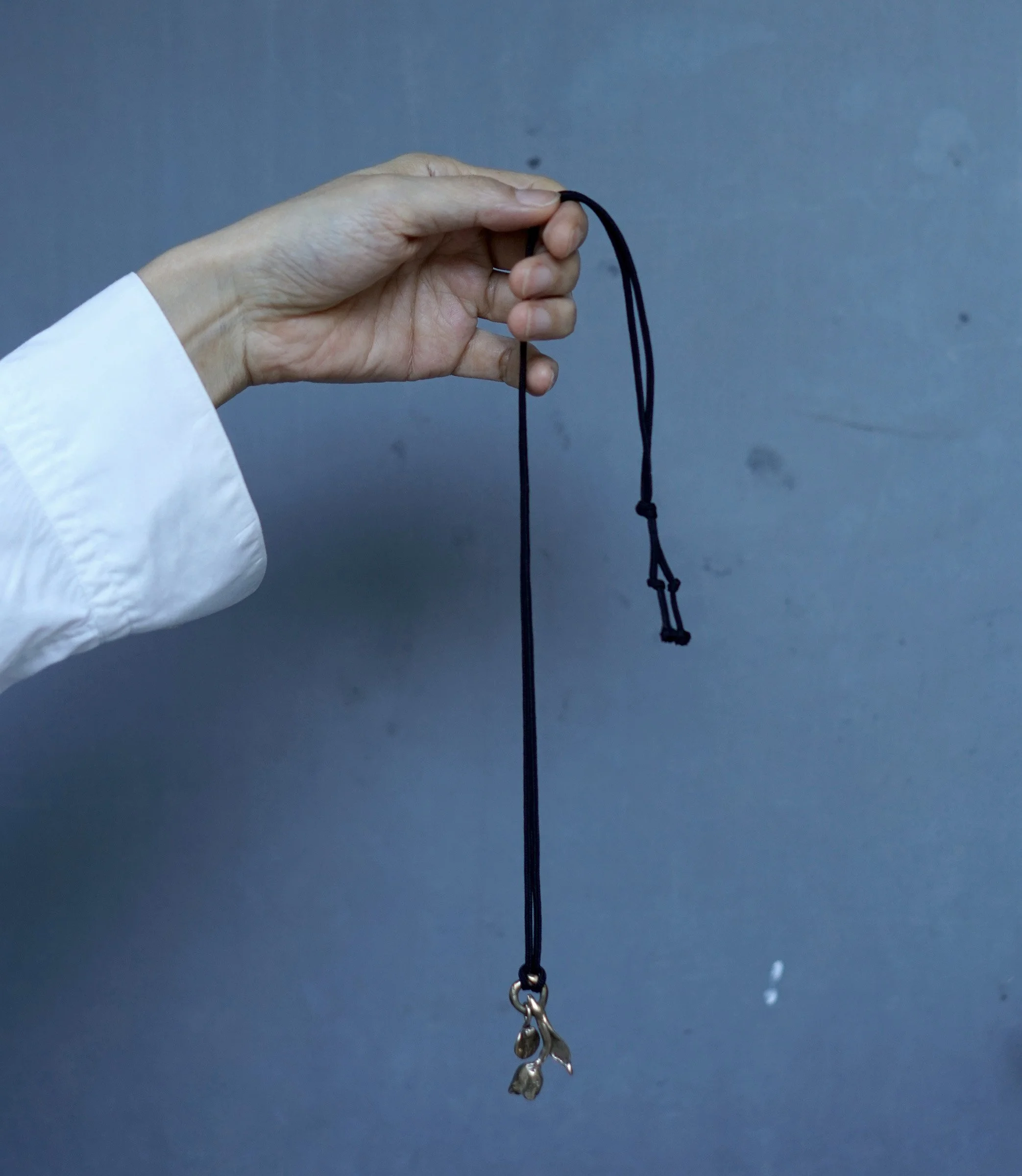 Tulip necklace is made of bronze without additional plating to preserve its natural texture which will darken in time naturally. Capturing the beauty of undone. Finished with delicate yet durable pure Japanese hand-knotted string.